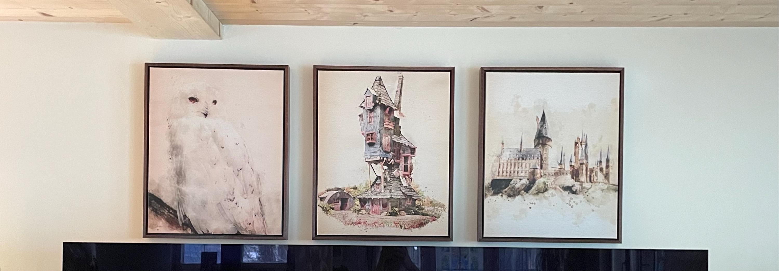 Wizard, mystical castle print, house decor, Wall art, castle print, Owl set of 3 Portraits, Wizards Room Décor, Magical Watercolor Print. Let your personality be reflected on the artwork adorning your walls. This vertical gallery wrapped canvas print will always look as tight and flat as the day it was made. Every frame is built with a solid face to support the canvas and prevent deforming. Available in multiple sizes, comes in walnut and black frame options. Beautiful and sensual artwork. Unique and modern design for your home.