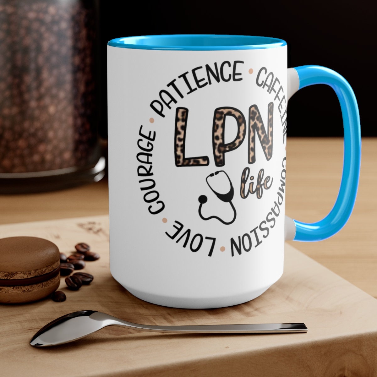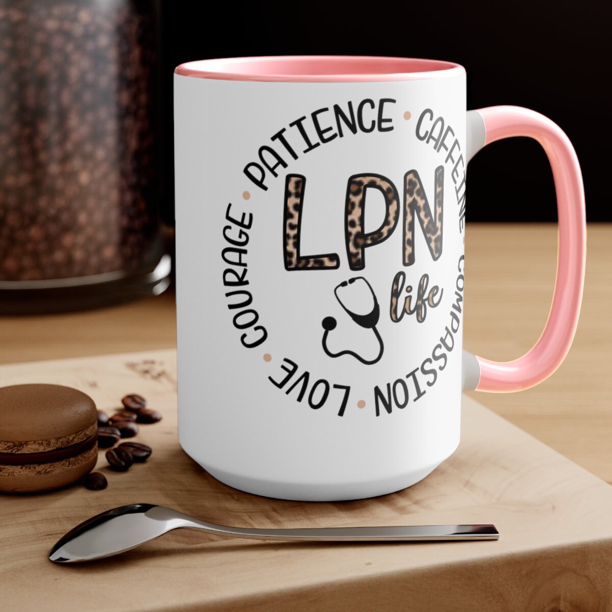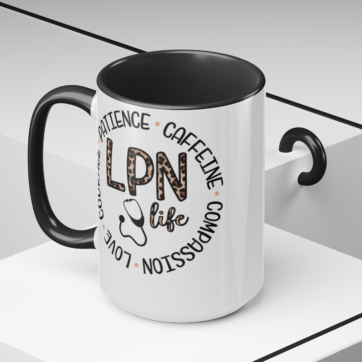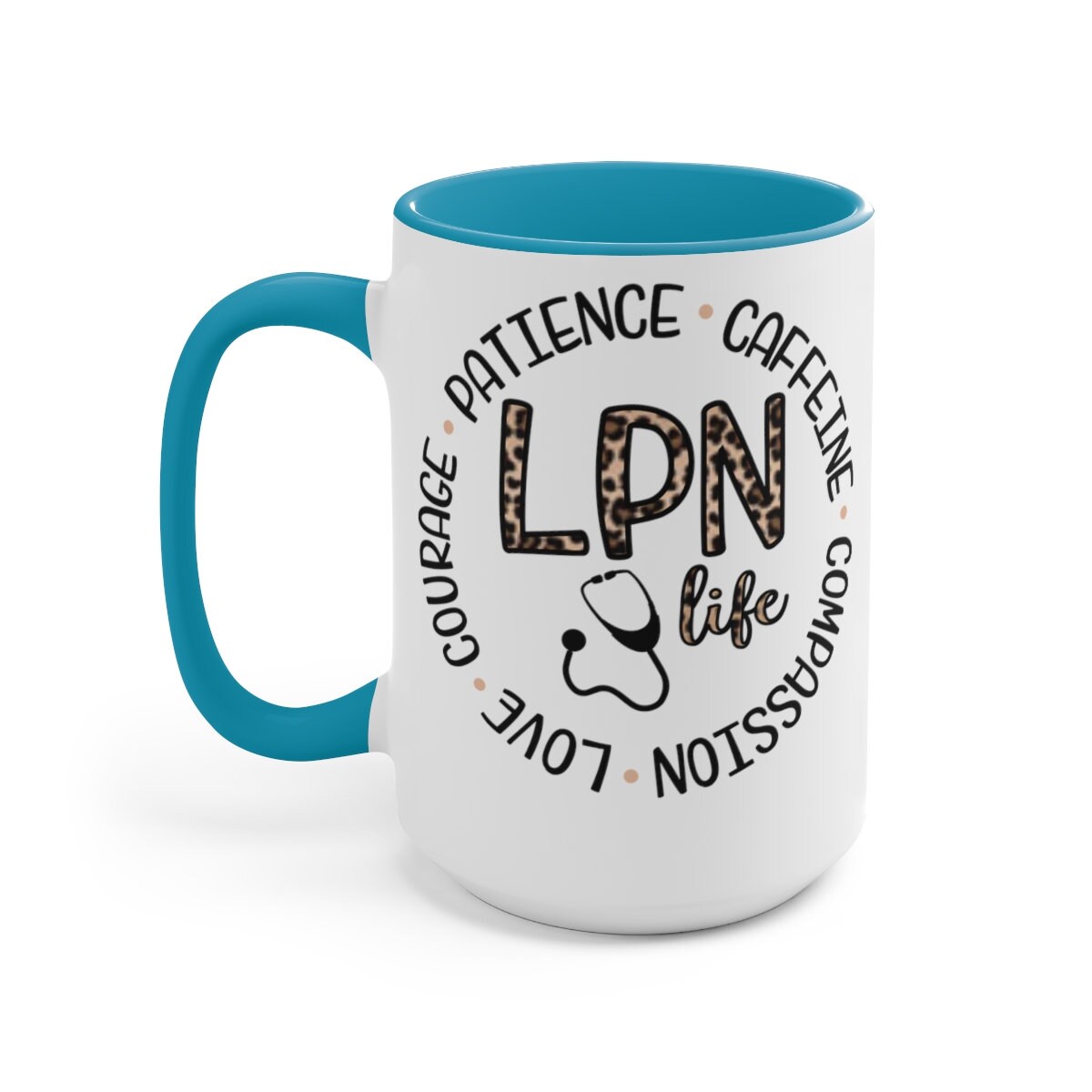 Here to bring big gulps of coffee and style, these two-tone Animal Print LPN, Nurses coffee mugs help people around the world start the day just right. Choose between 5 different color options to best complement your designs. Each mug comes with a colored handle, a colored interior, and a classy, glossy finish so that your mugs become an instant favorite. \n.: Material: 100% ceramic\n.: One size: 15oz (0.44 l)\n.: Glossy finish\n.: Interior and handle available in 5 colors\n.: Easy-grip C-shaped handle
