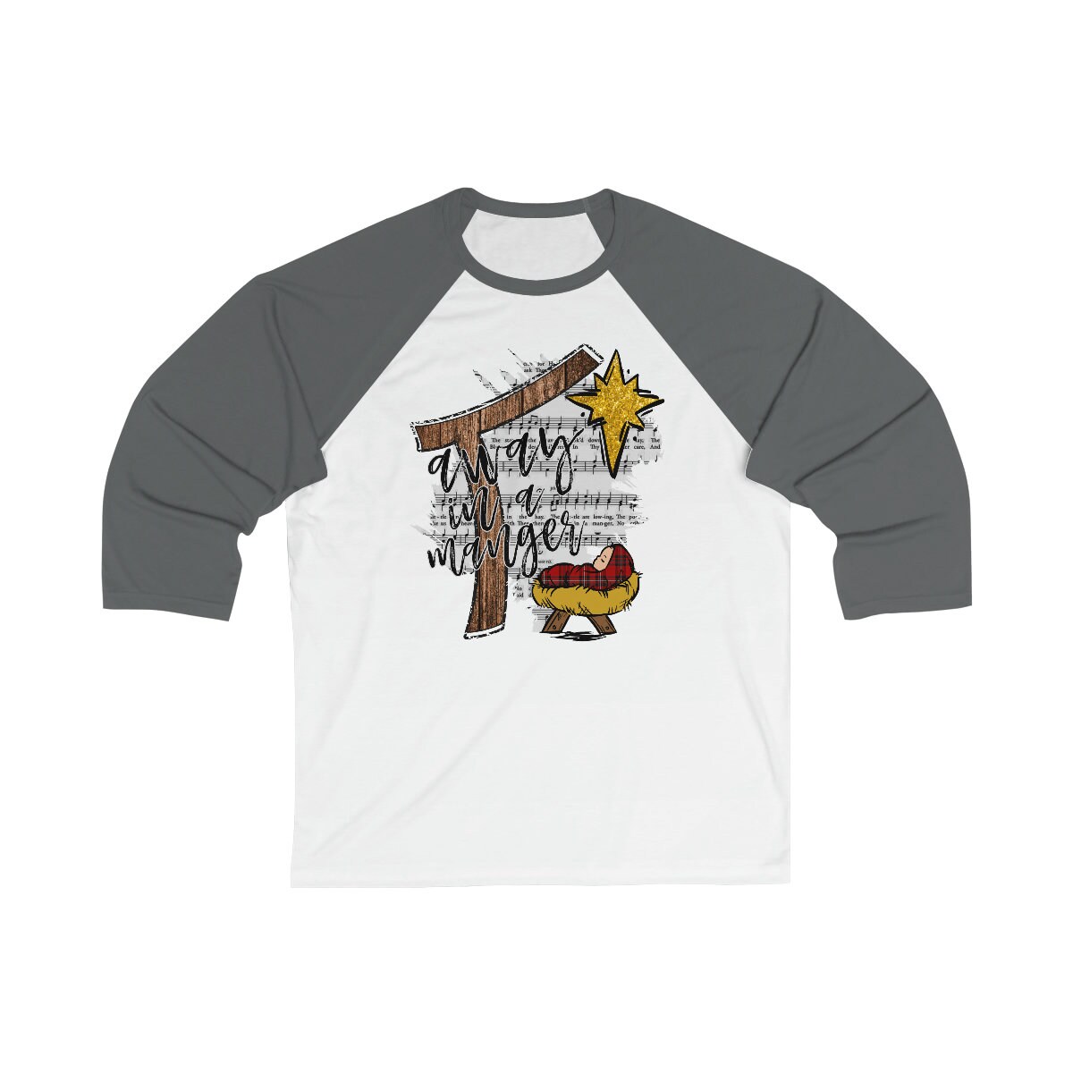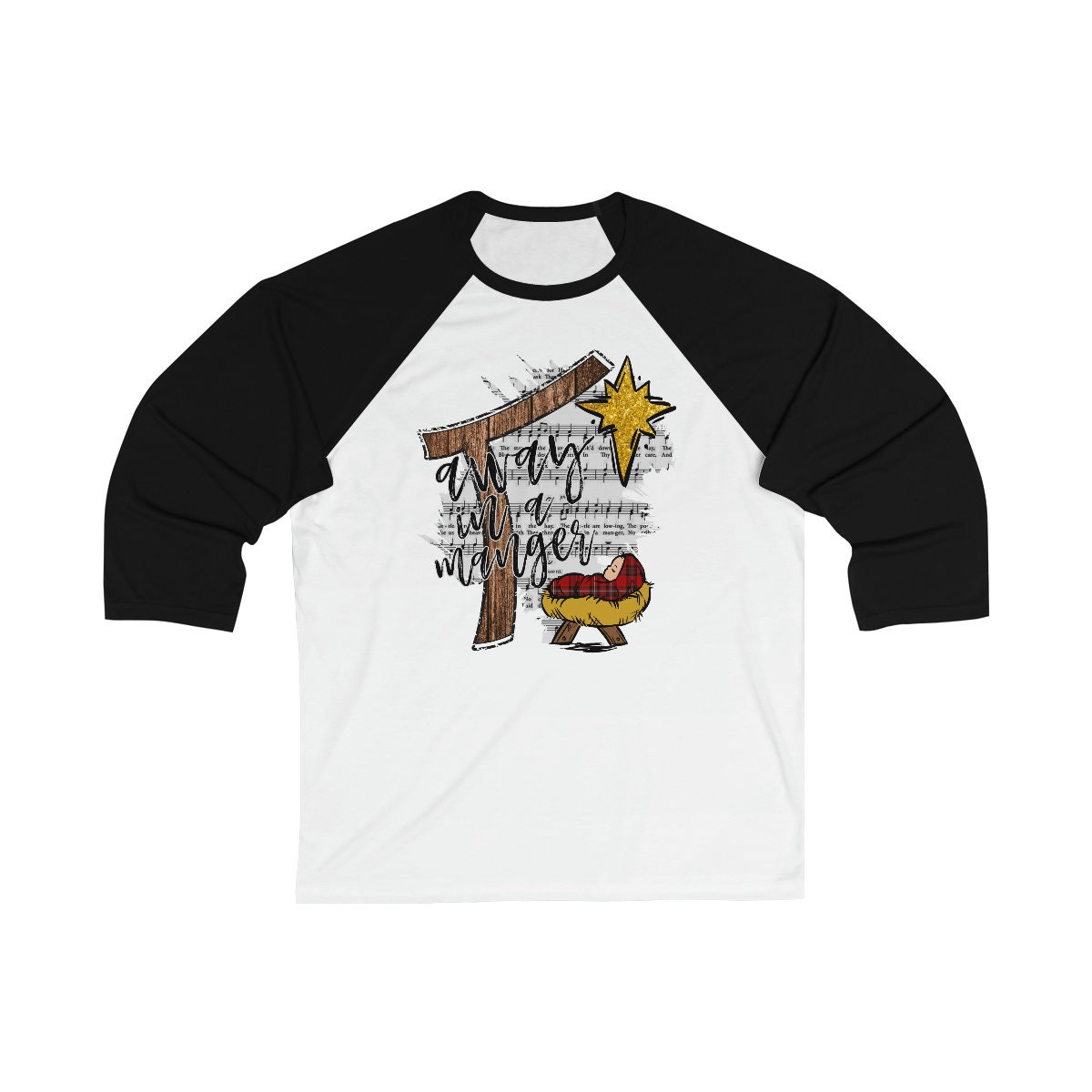 The unisex 3/4 sleeve Christmas Away in a manger song baseball tee makes it an ideal printing surface because the sleeves act as a frame. So, whichever design the shirt has appears better than ever. Depending on the color, these shirts can be a blend of cotton, polyester, and rayon. The collar is ribbed knitting for improved durability. The sides have seams to provide structural support.