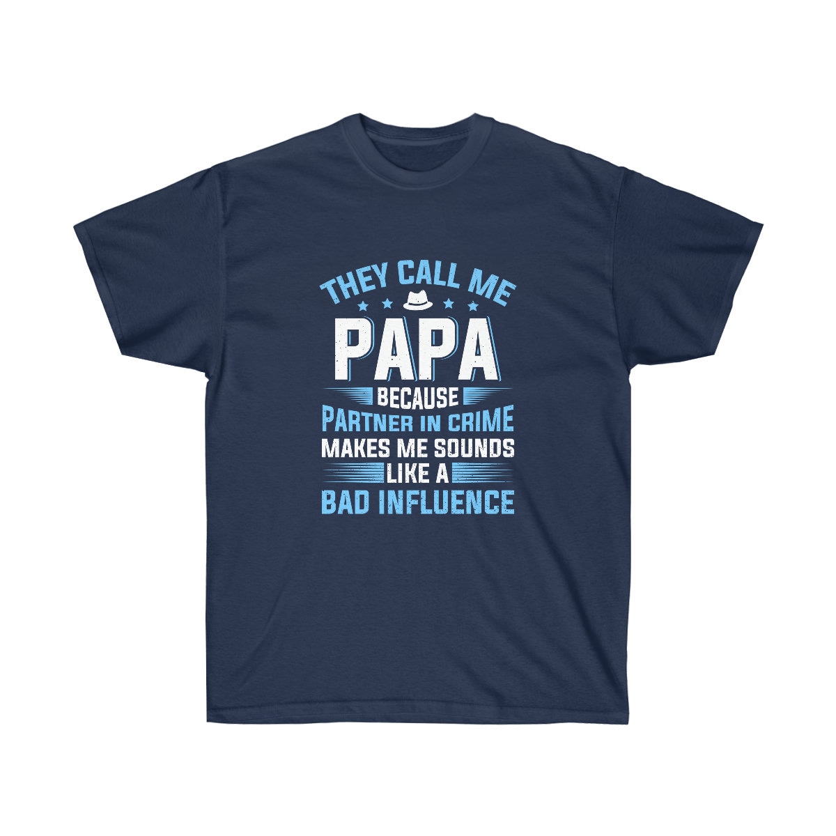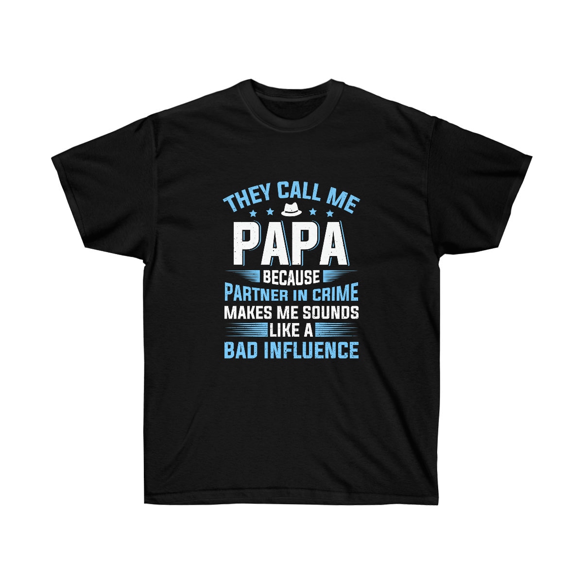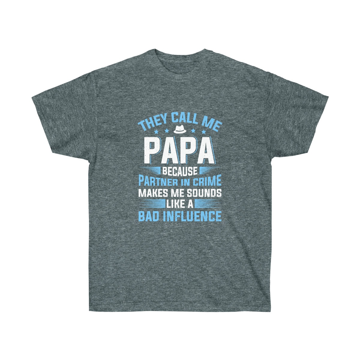 This they call me Papa unisex ultra cotton tee is a classic. Quality cotton construction means that designs are sure to shine. The shoulders are tapped for a good upper-body fit. There are no side seams, ensuring a clean, unbroken flow. The collar has ribbed knitting for improved elasticity. The materials that went into this product are sustainably sourced and economically friendly. \n.: 100% Cotton (fiber content may vary for different colors)\n.: Medium fabric (6.0 oz/yd² (203 g/m²))\n.: Classic fit\n.: Tear-away label\n.: Runs bigger than usual