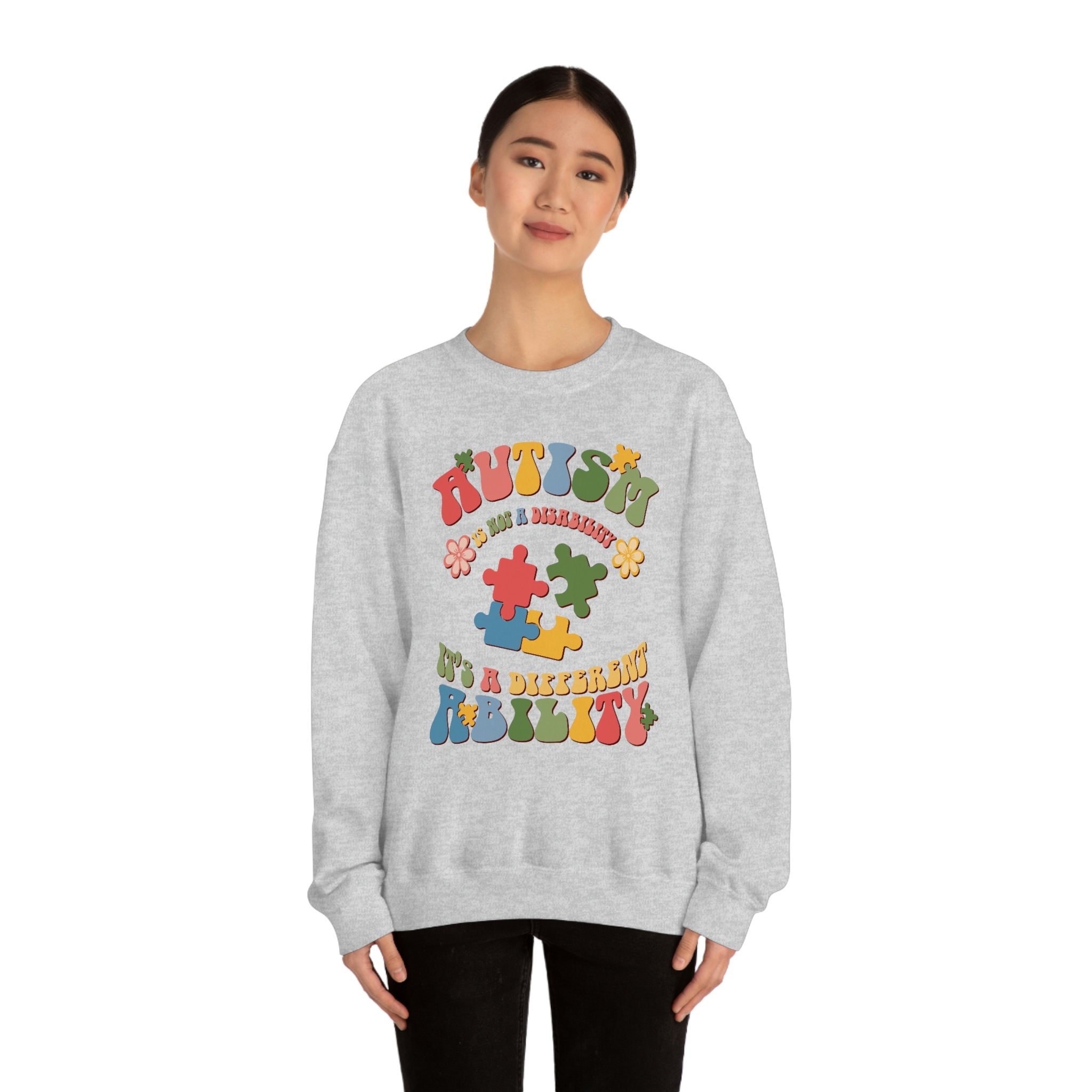 Autism, Autism Awareness, Unisex Heavy Blend Crewneck Sweatshirt. Ideal for any situation, a unisex heavy blend crewneck sweatshirt is pure comfort. These garments are made from polyester and cotton. This combination helps designs come out looking fresh and beautiful. The collar is ribbed knit, so it retains its shape even after washing. There are no itchy side seams on these sweaters.
