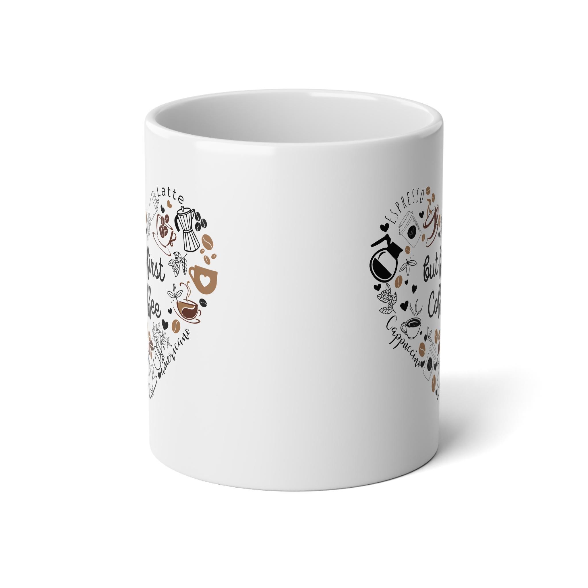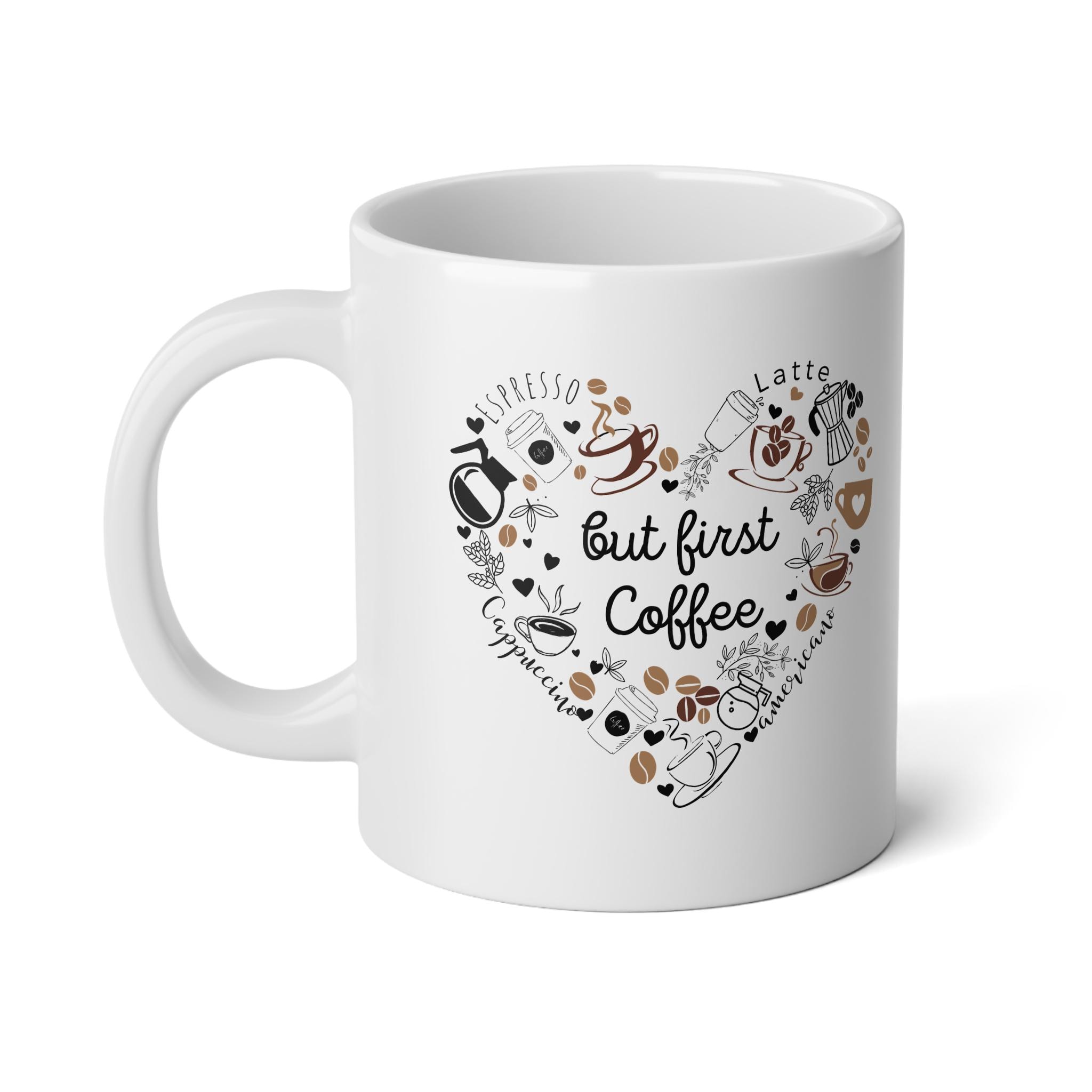 But first coffee, coffee mug, coffee cup, houmous saying, Jumbo Mug, 20oz. Perfect for that extra boost of coffee or large amounts of hot cocoa on a rainy day, this ceramic mug comes in the perfect size: 20oz (0.6l). Thanks to the ORCA coating, your original designs will be printed in picture-perfect quality on the white ceramic base with a glossy finish. The mug features a C-shaped, easy-grip handle.