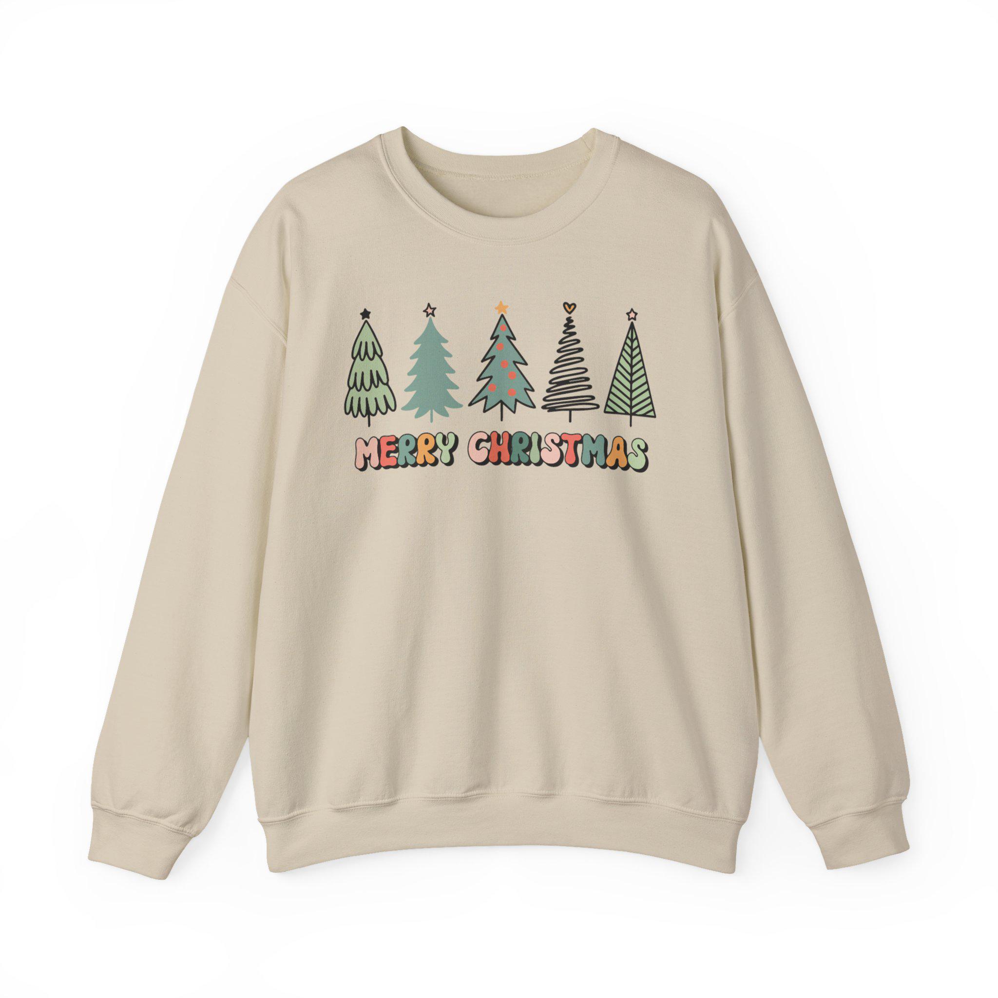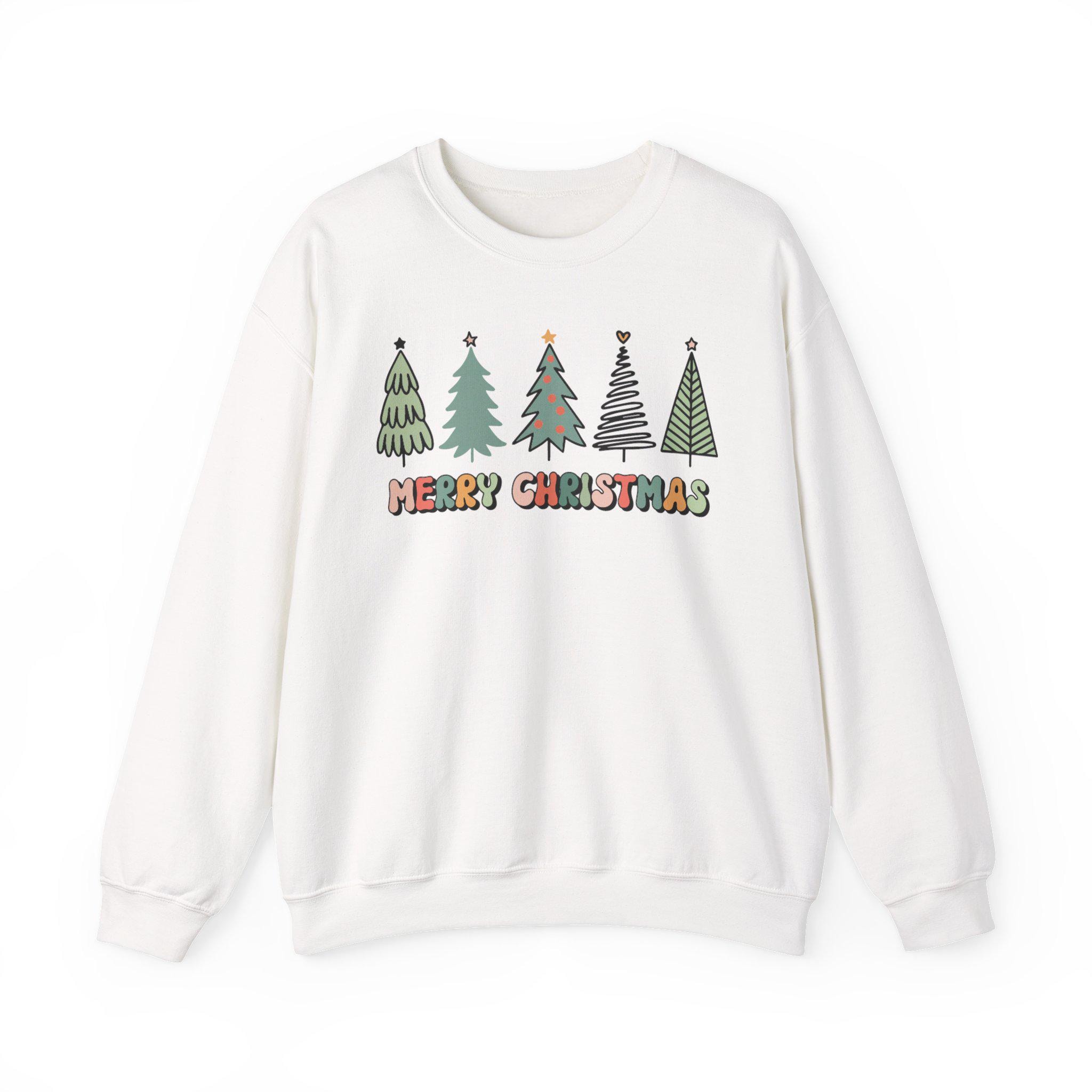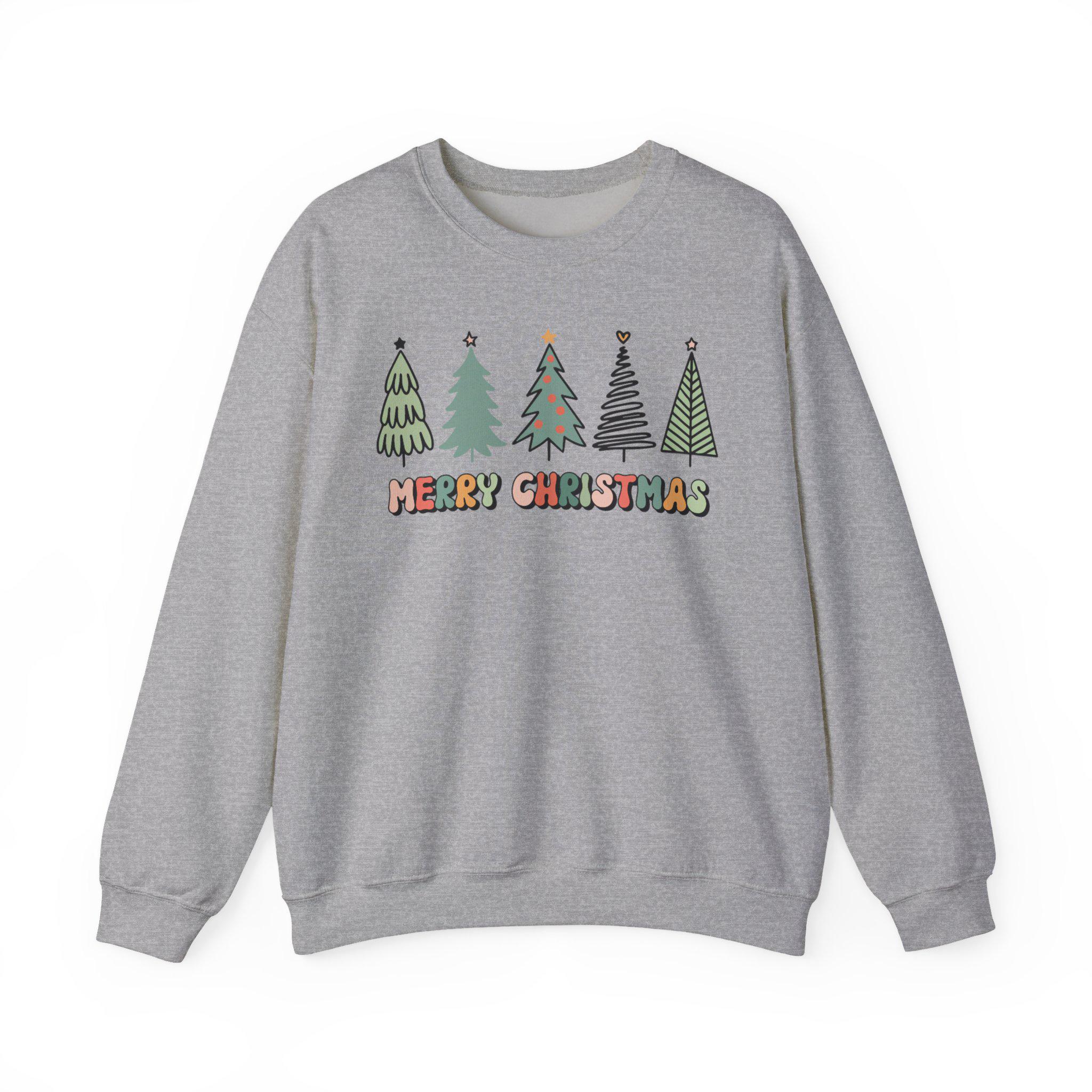 Womens retro Christmas Sweatshirt, Christmas Tree Shirt, Farmhouse Christmas Sweater, Minimalist Holiday Shirt, Winter Crewneck Sweatshirt. Ideal for any situation, a unisex heavy blend crewneck sweatshirt is pure comfort. These garments are made from polyester and cotton. This combination helps designs come out looking fresh and beautiful. The collar is ribbed knit, so it retains its shape even after washing. There are no itchy side seams on these sweaters.